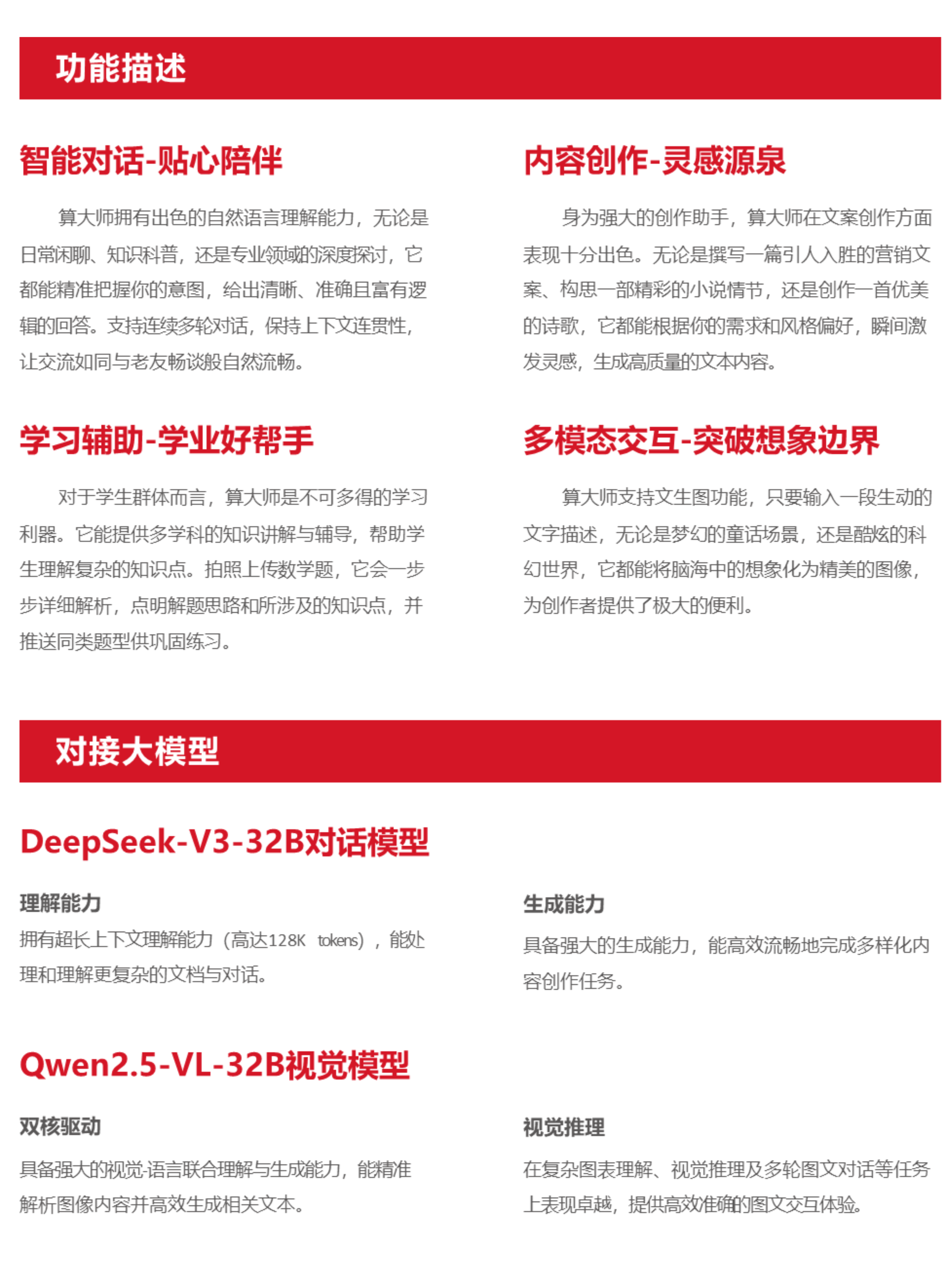 在科技飞速发展的今天,人工智能正深刻改变着我们的生活与工作方式。算大师是一款集成多种AI模型的智能工具,完全适配国产化信创环境。核心功能包括:集成DeepSeek-v3对话模型(128K超长上下文)和Qwen3-VL视觉模型,支持文档解析、AI绘图及代码生成。具备简洁界面、强大本地处理能力,开箱即用,以其强大的功能和卓越的性能,成为众多用户信赖的智能助手,开启了全新的智能交互时代。