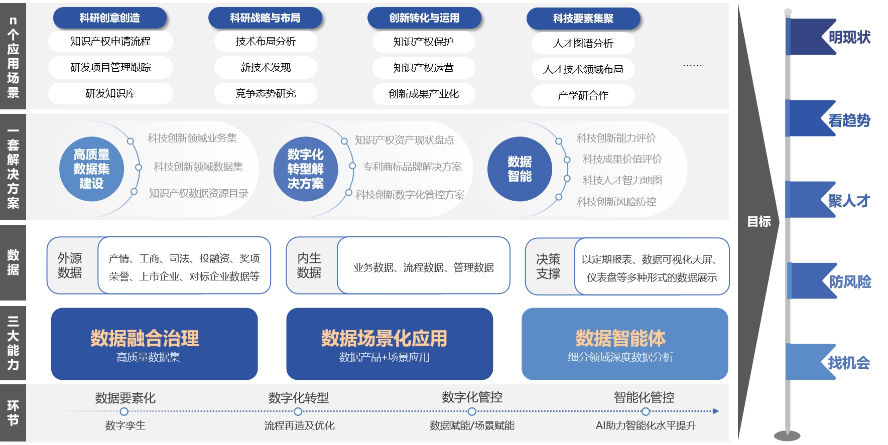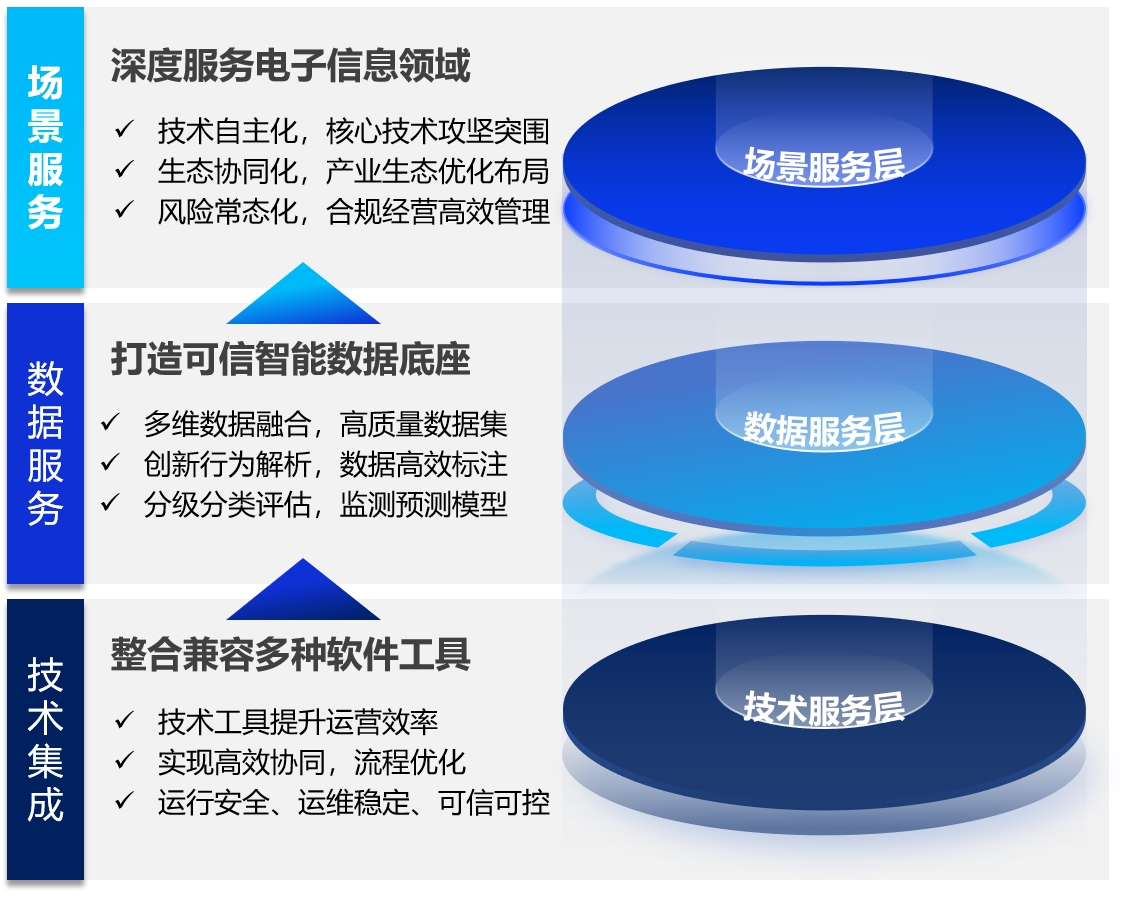 结合全球严峻竞争形势下国家对企业科技创新、自主可控的战略要求和新时代国家对于知识产权领域的新要求新战略新部署,特别是在电子信息领域,企业科技创新管理以“明现状、看趋势、聚人才、防风险、找机会”的需求设计,面向企业科技创新,深耕专利数据分析及技术情报研究,扩展数据范围和扩大数据分析维度;强化AI工具底座,深化对科技创新数据,特别是专利数据和价值的挖掘利用,不仅满足集团企业科技创新数字化管理的需求,更加在科技创新垂直场景提供风险监测、竞争态势、人才服务、科技情报等。