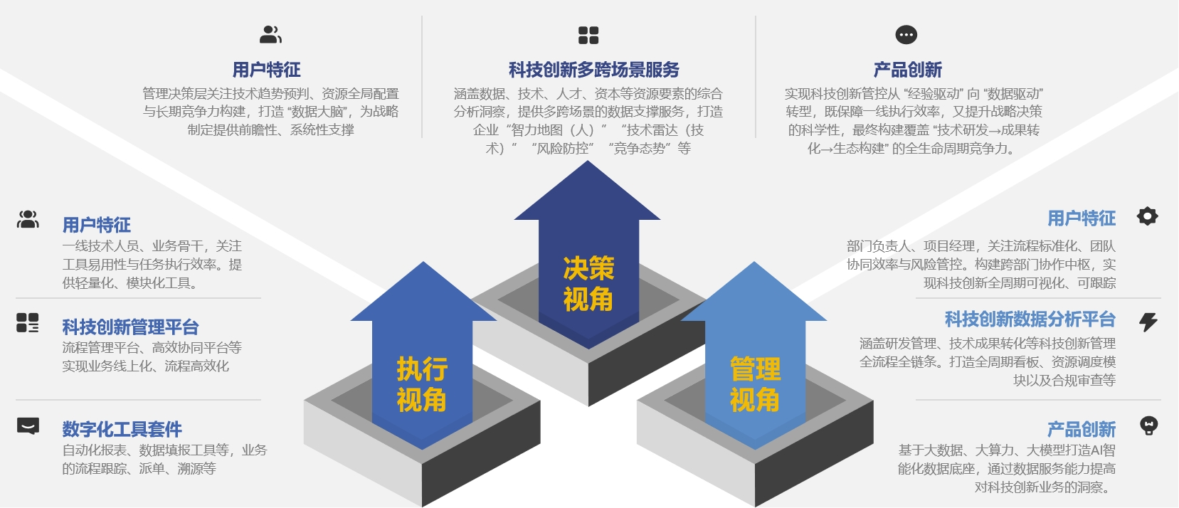 该平台面向不同用户,提供多样化产品选择。企业科技创新数字化管控作为自上而下的建设逻辑,面向不同用户提供多层次、多样化的产品,对于在业务执行层、管理层及战略制定的决策层的多类用户,围绕业务执行层、管理层、决策层的核心需求,构建 “工具赋能→流程管控→战略洞察” 的全链条解决方案。