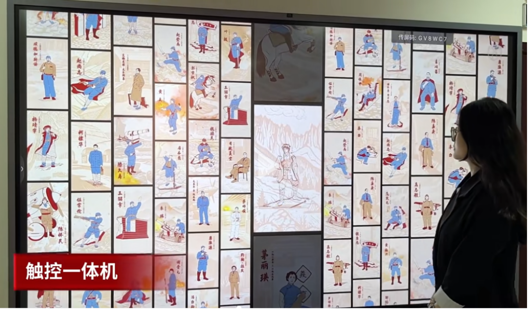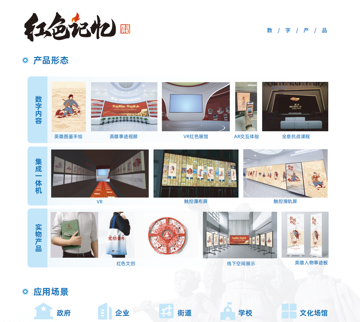 以参与建党、建军、建国的英雄人物为核心,将视觉、多媒体艺术与虚拟现实、全息投影、触控交互技术相结合,研发出一款“红色记忆”数字产品,主要由英雄人物生平事迹木刻版画电子图谱、主题课程和VR全景展厅等部分构成,以触控大屏、VR眼镜为载体,可应用于企事业单位的党建活动、主题教育、文教展馆等场景。