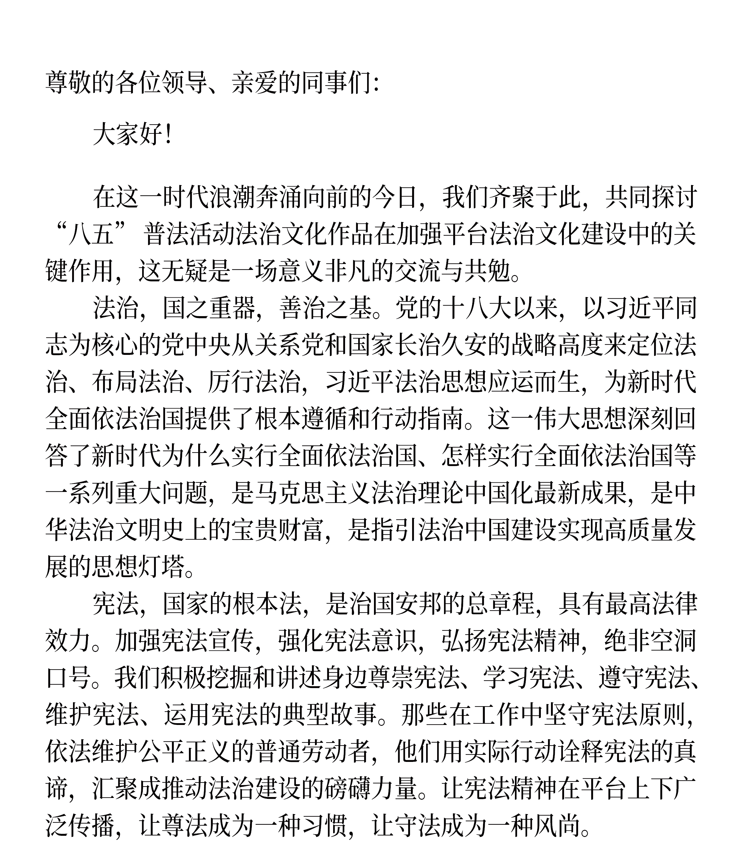 作品立足“八五”普法时代背景,系统论述了法治文化建设的深远意义。文章以习近平法治思想为引领,深入阐释了宪法权威、德法共治、热点民生法治等核心议题,强调普法责任制是弘扬法治精神的关键路径。作品思想深刻、逻辑严密,不仅是一篇优秀的征文,更是一份关于如何通过文化创作凝聚法治共识、照亮前行道路的深刻思考。