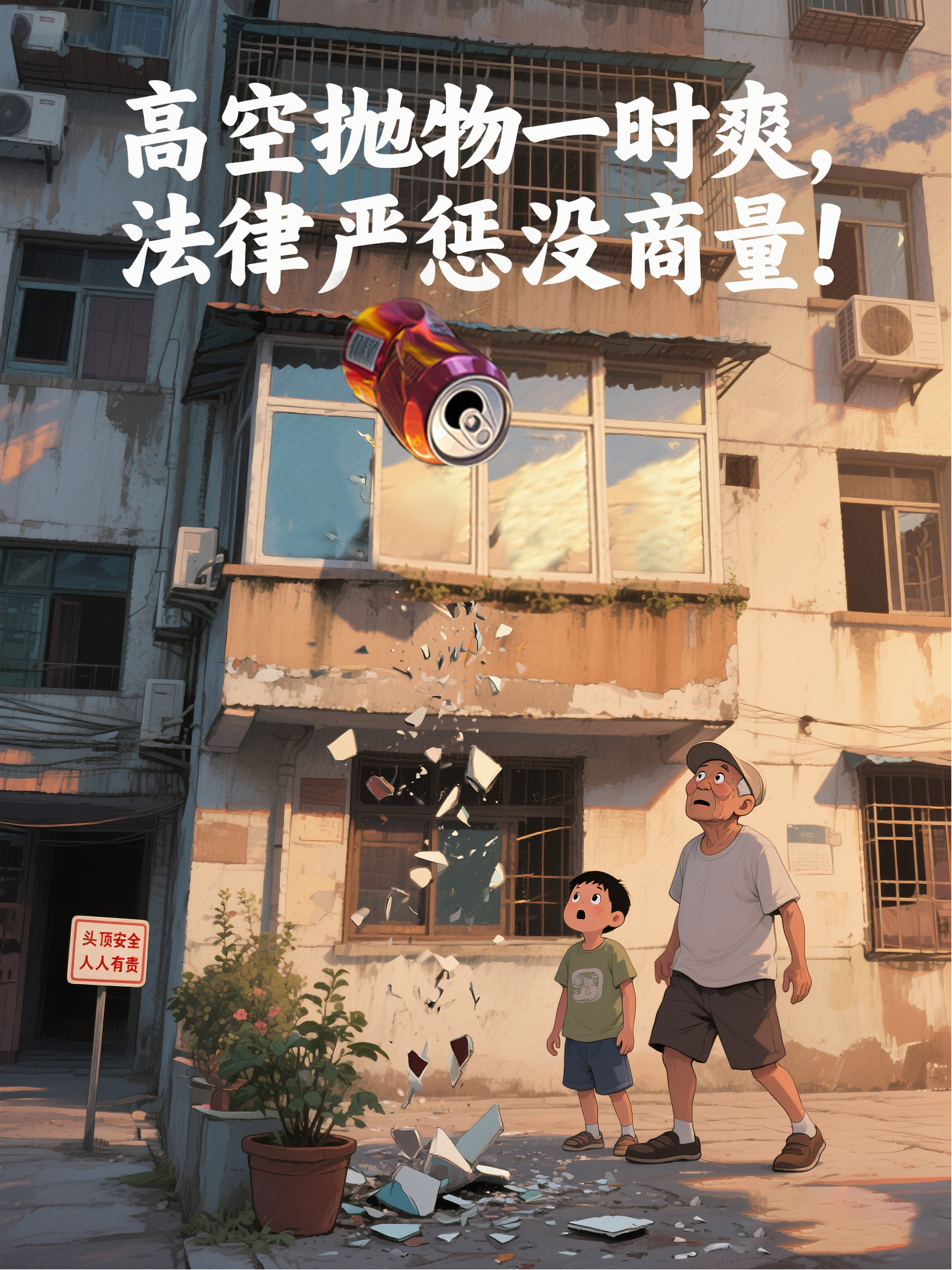 作品是AI创作与智慧普法深度融合的创新典范。海报以《民法典》第一千二百五十四条为核心,通过高度凝练的视觉语言,将“高空抛物”的法律禁令转化为冲击力极强的瞬间画面——一个高速下坠的易拉罐与爷孙惊愕仰视形成的对角线构图,直指"头顶的安全"这一民生痛点,是推动民法典条款“飞入寻常百姓家”的生动实践。