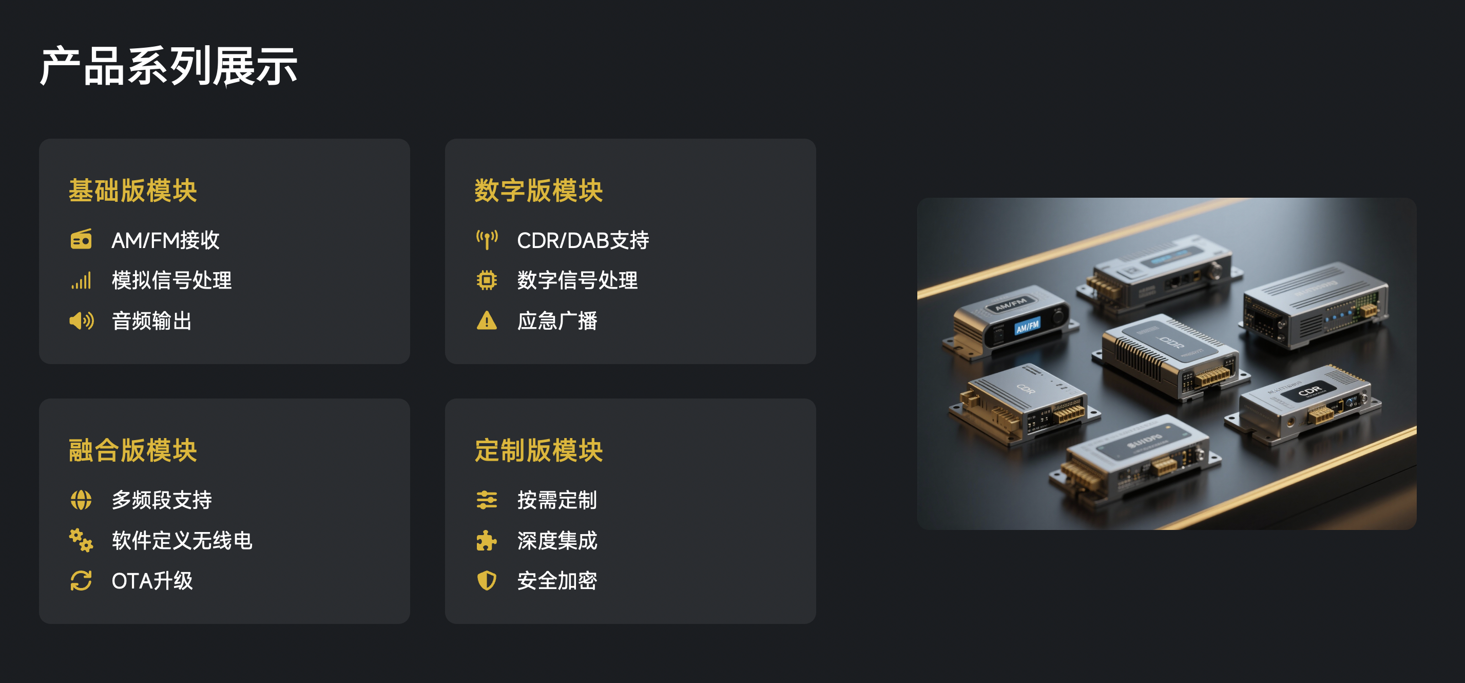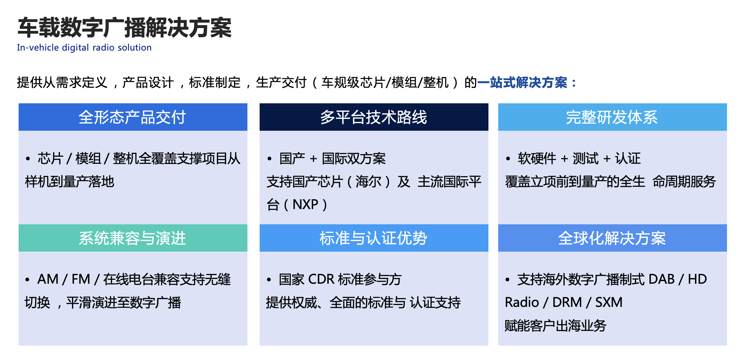 在当前汽车技术高速迭代的背景下,北京电控信息服务产业平台推出的车载数字广播强制标准解决方案拥有模块化产品矩阵,满足定制化专属需求,全面覆盖不同层次的车载音频系统升级路径,协助推动产业升级。